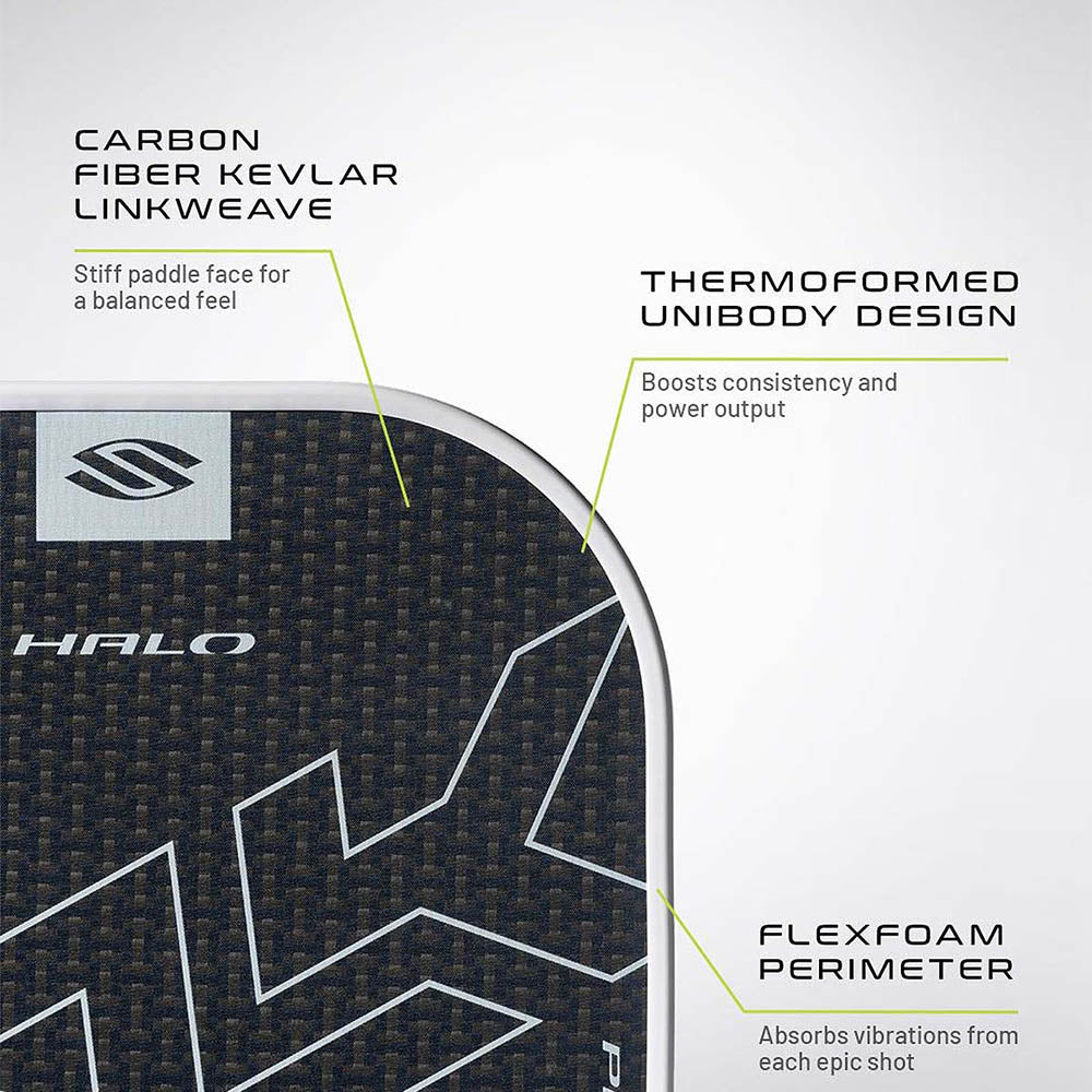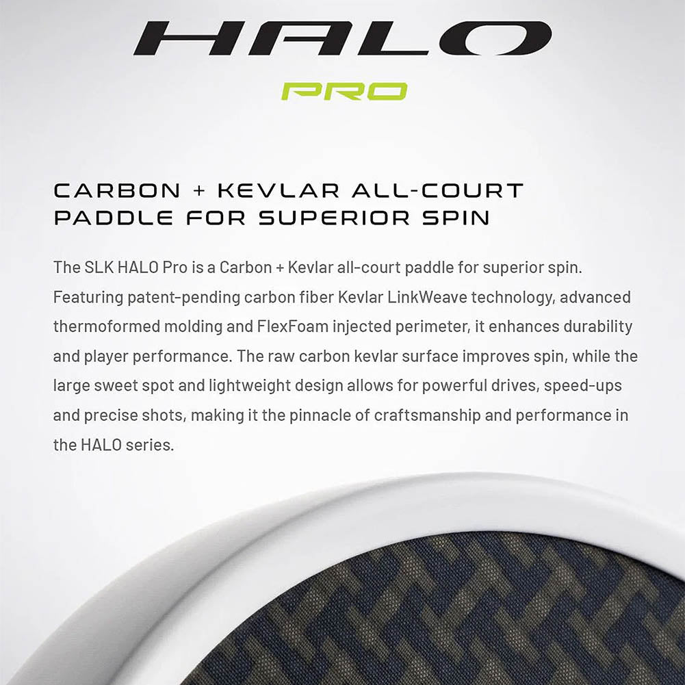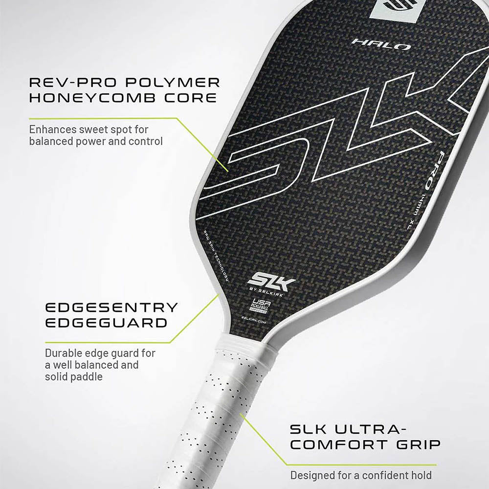 SLK Halo Pro Max’s Carbon Fiber Kevlar® LinkWeave face is a game-changer, combining two premium materials to deliver unmatched strength, spin potential, and shot precision. This unique face composition enhances ball dwell time, allowing players to impart greater spin and execute finesse shots with ease. Whether you’re driving the ball down the baseline or executing a soft drop shot, this paddle delivers exceptional responsiveness and a consistent feel.